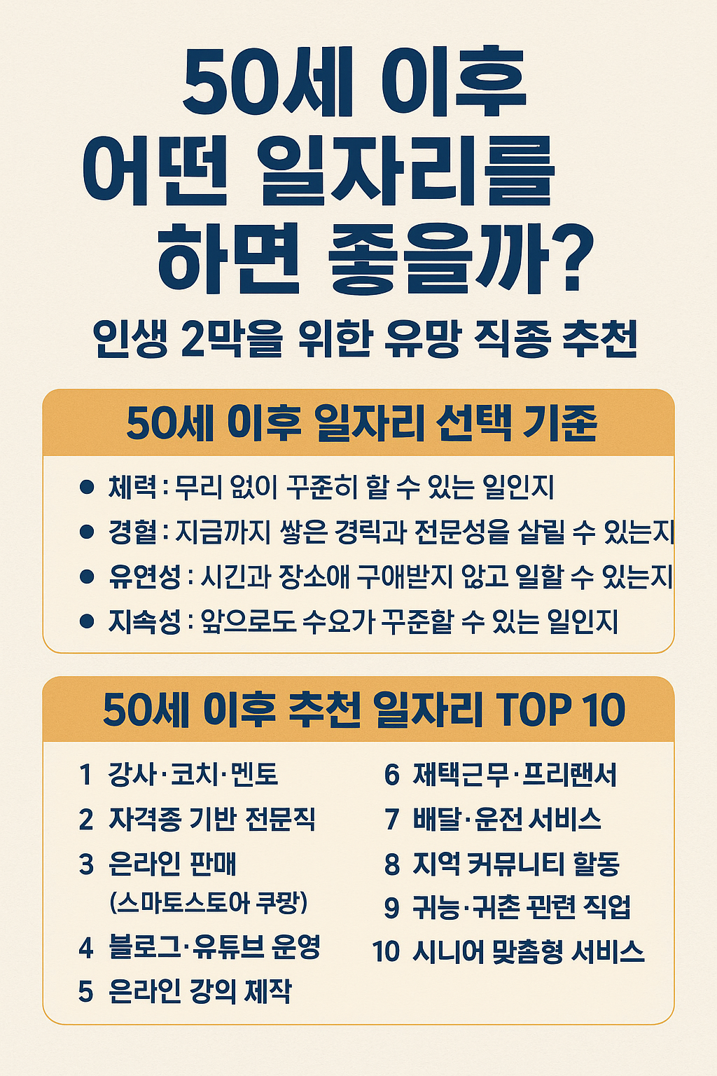 나이가 50세가 넘으면 많은 분들이 “앞으로 어떤 일을 하며 살아야 할까?” 고민하게 됩니다. 은퇴는 가까워지고, 체력은 예전 같지 않지만 여전히 일할 의지와 경험은 풍부하기 때문입니다. 그렇다면 50세 이후에는 어떤 일자리가 적합할까요? 이번 글에서는 50대 이후 추천 일자리와 선택 기준을 정리해 보겠습니다.50세 이후 일자리 선택 기준나이에 상관없이 일을 할 수 있지만, 50세 이후에는 특히 아래 요소들을 고려해야 합니다.체력: 무리 없이 꾸준히 할 수 있는 일인지경험: 지금까지 쌓은 경력과 전문성을 살릴 수 있는지유연성: 시간과 장소에 구애받지 않고 일할 수 있는지지속성: 앞으로도 수요가 꾸준할 수 있는 일인지50세 이후 추천 일자리 TOP 101. 강사·코치·멘토50대라면 누구보다 풍부한 경험을 ..