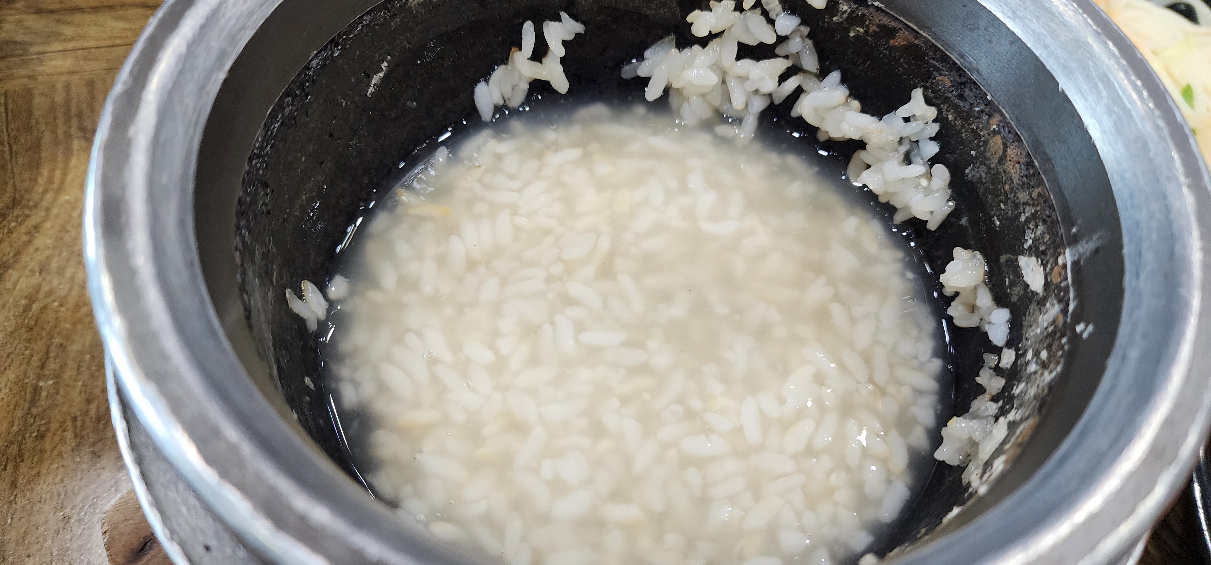 돌솥밥에서 밥을 덜어낸 후 남은 솥에 뜨거운 물을 부어 누룽지를 만듭니다.