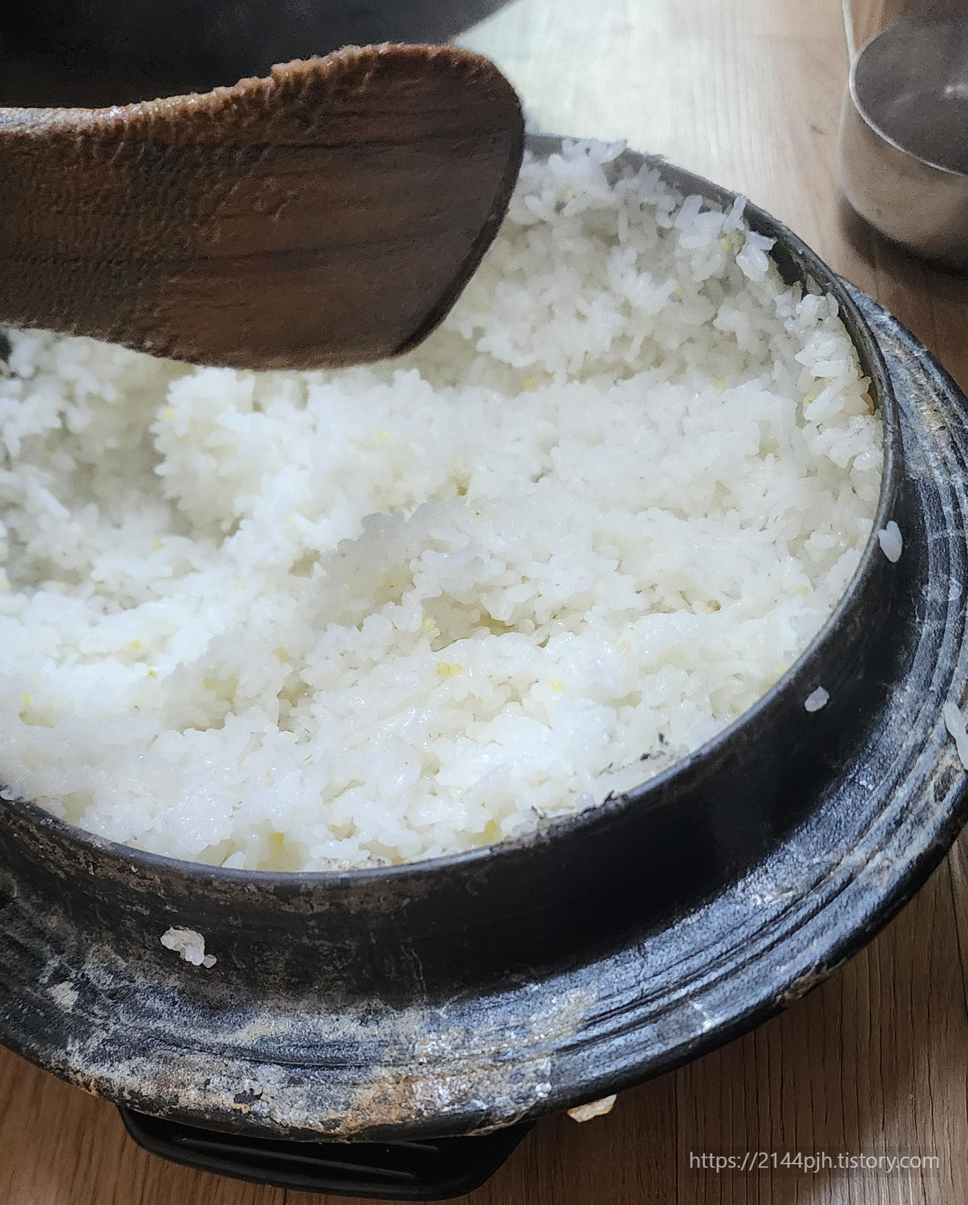 가마솥에서 갓 지어 나온 김 모락모락 나는 밥을 사장님이 직접 퍼주십니다. 밥만 먹어도 고소하고 맛있어요.