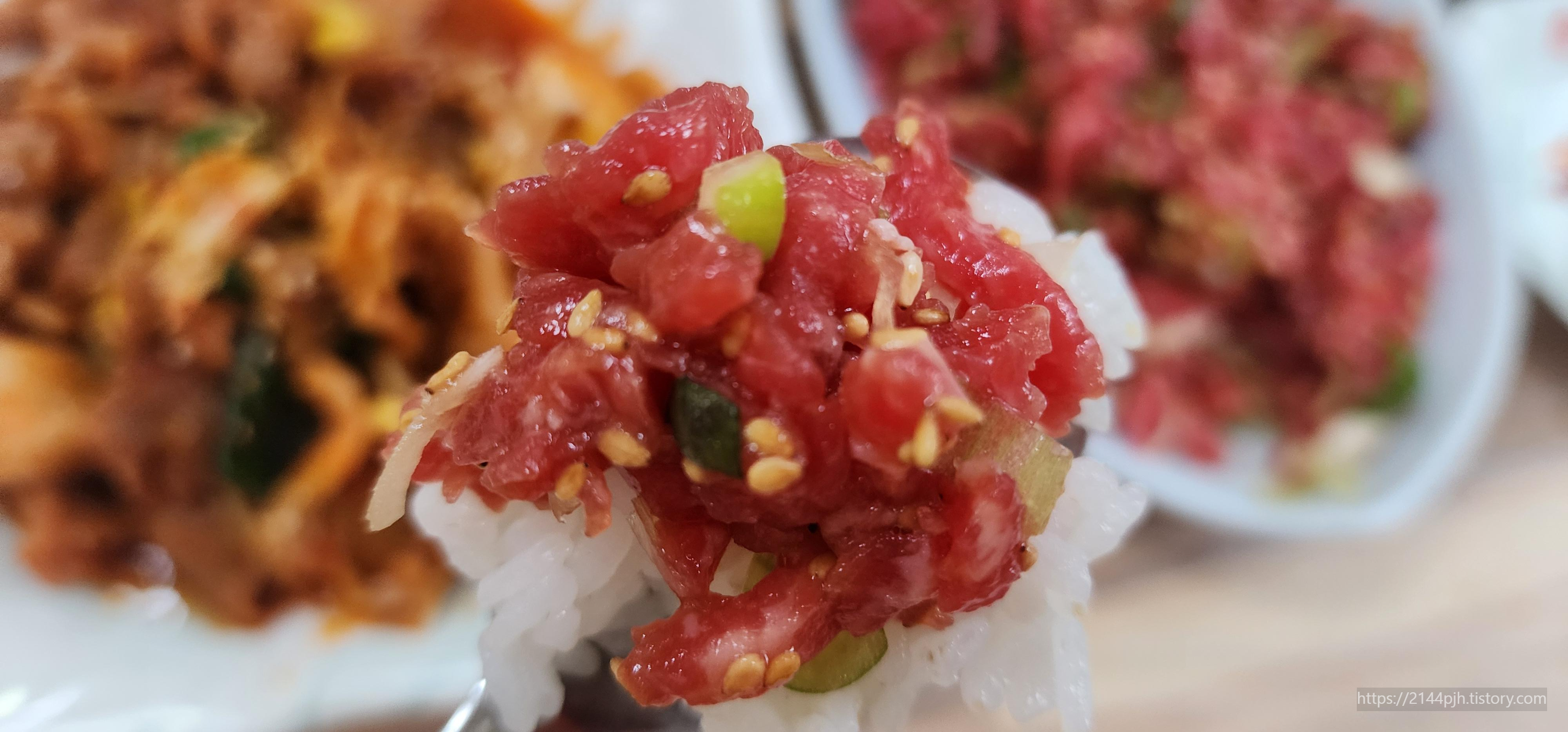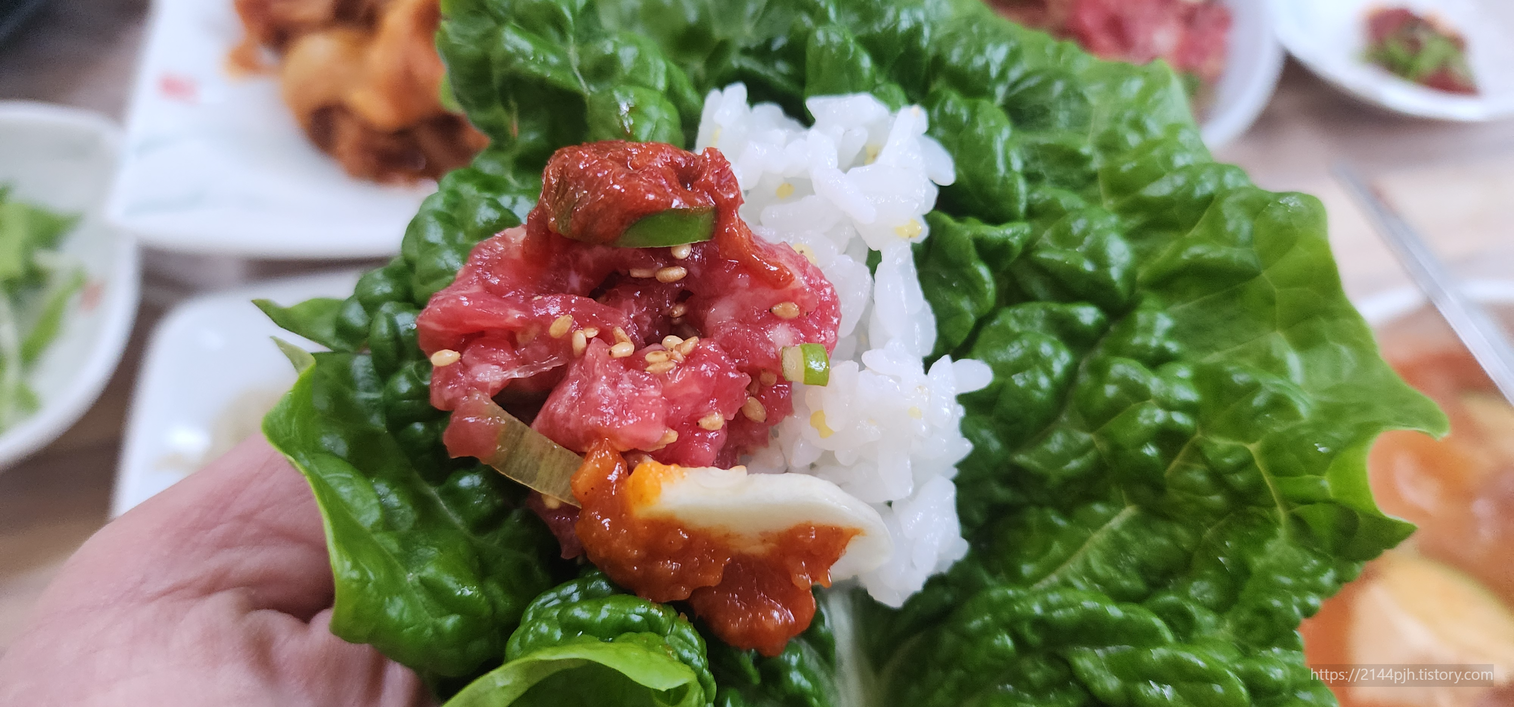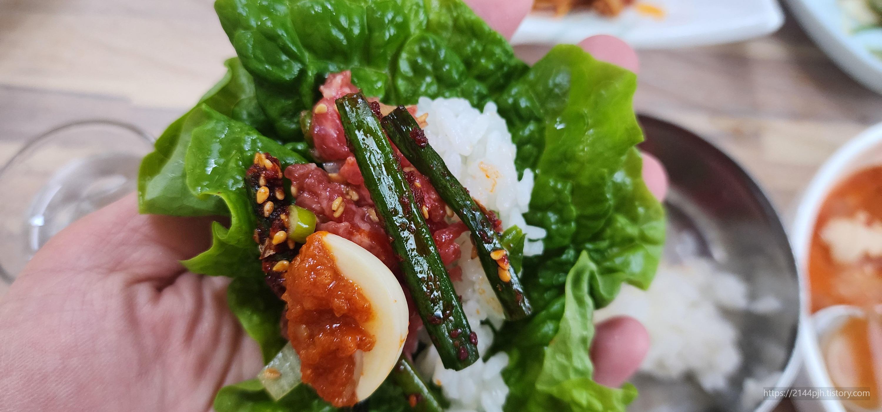 육회는 싱싱한 한우로 만든 부드러운 식감이 일품! 저는 상추 한 장 위에 밥, 육회, 쌈장, 마늘, 갈치속젓을 올려 한쌈 했어요. 육회의 고소함과 갈치속젓의 짭조름함이 만나 입안에서 완벽한 조화를 이루더라고요. 😍