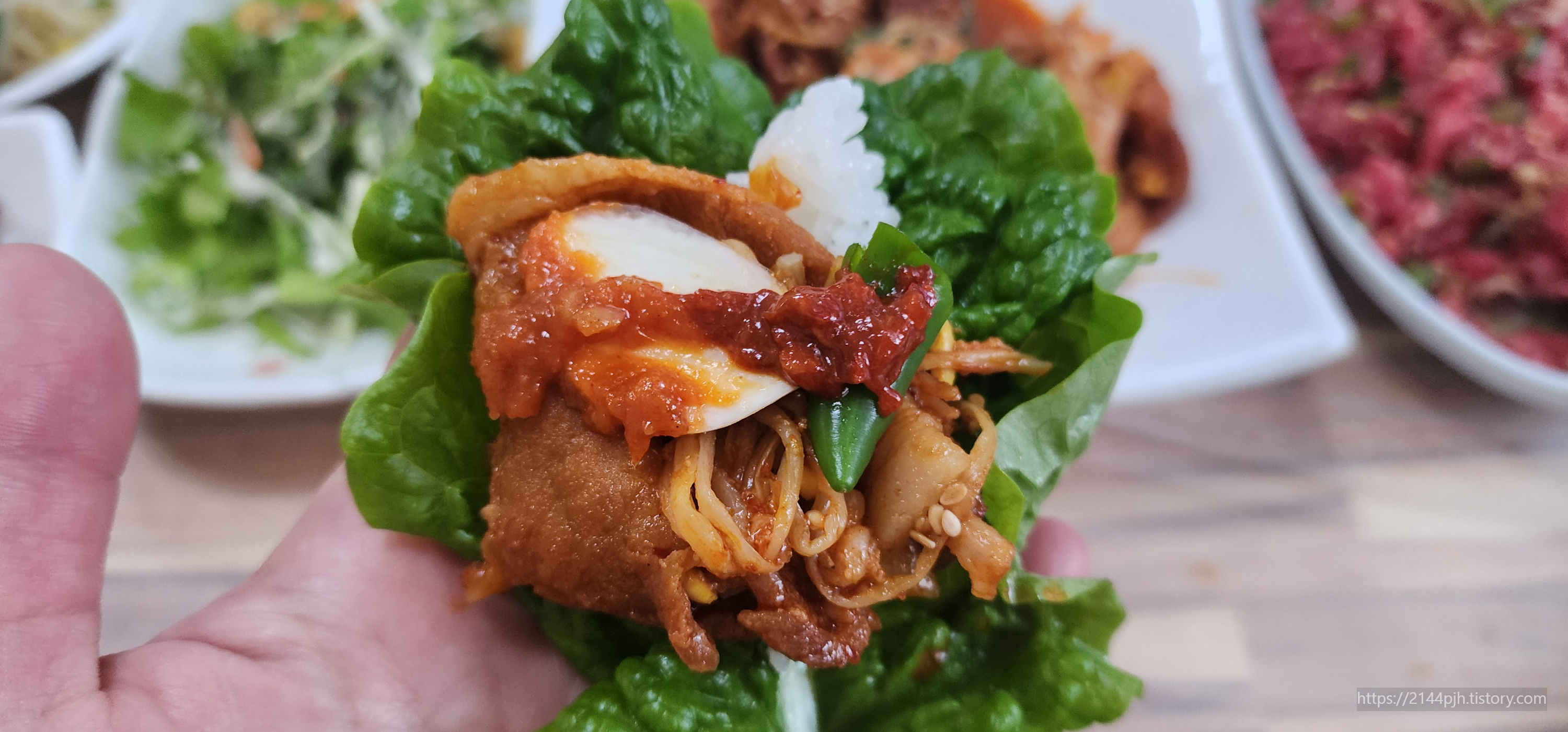 육회는 싱싱한 한우로 만든 부드러운 식감이 일품! 저는 상추 한 장 위에 밥, 육회, 쌈장, 마늘, 갈치속젓을 올려 한쌈 했어요. 육회의 고소함과 갈치속젓의 짭조름함이 만나 입안에서 완벽한 조화를 이루더라고요. 😍