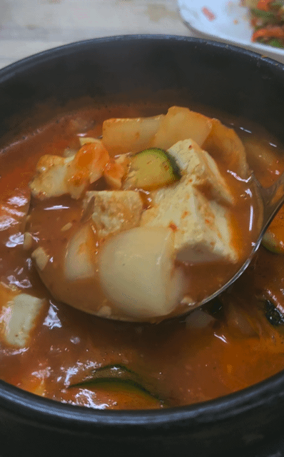 같이 나오는 뚝배기 된장찌개도 별미예요. 두부, 호박, 양파가 듬뿍 들어가 있어 국물 맛이 진하고 깊어요. 이거 하나만 있어도 밥 한 공기는 뚝딱!