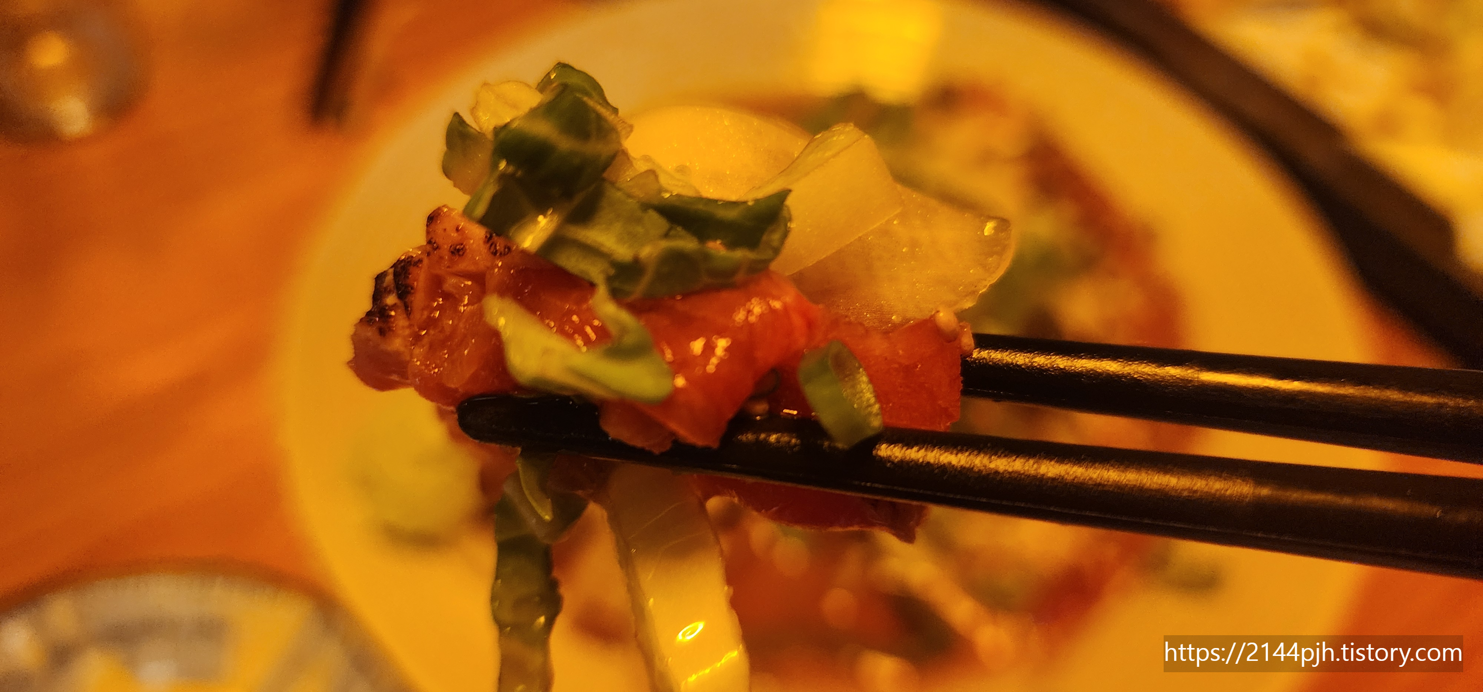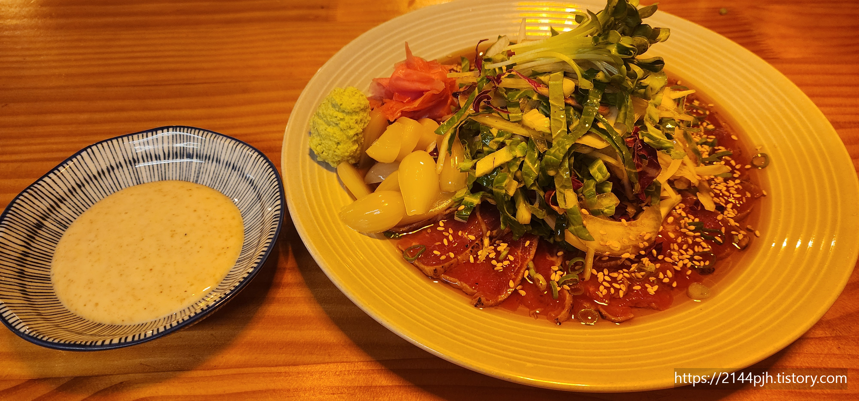 추가로 주문한 소고기 채끝 타다끼는 유자폰즈소스에 얇게 썰어진 형태로 나왔어요.