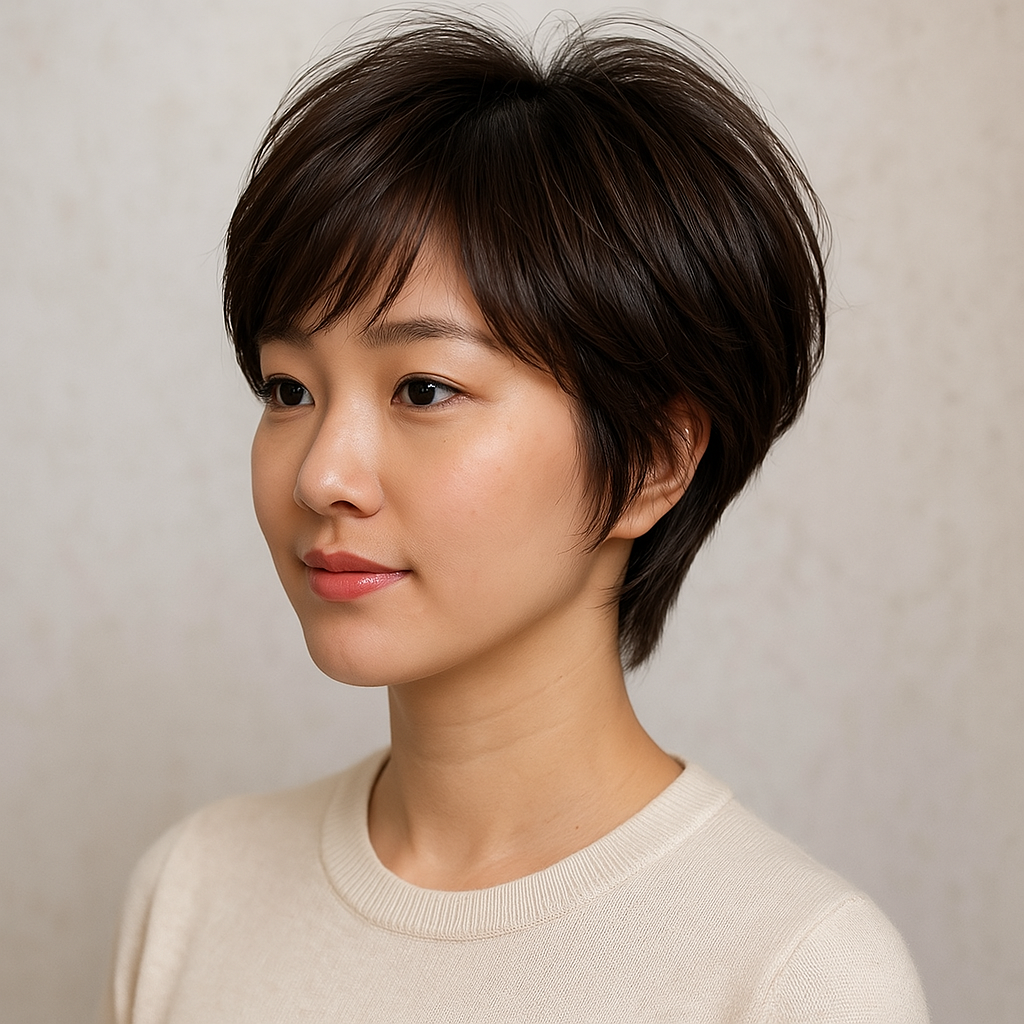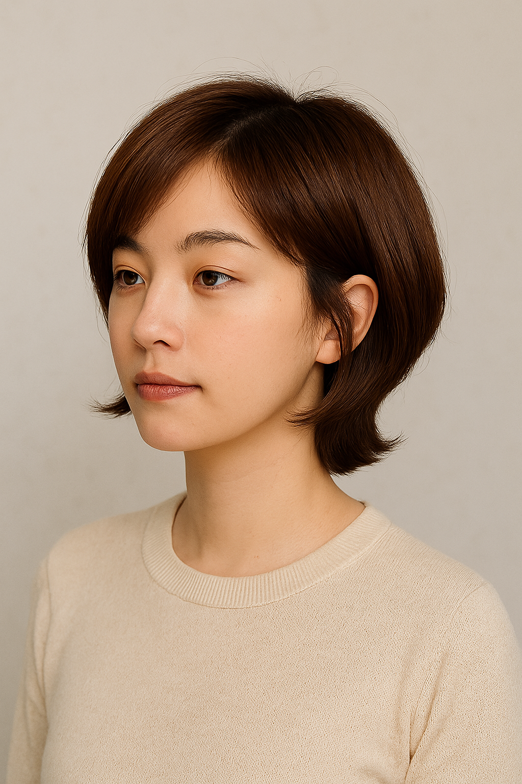 부드러운 C컬로 스타일링한 숏컷은 여성스러운 매력을 극대화합니다. 볼살이 있는 분들도 얼굴 라인을 부드럽게 만들어 주는 효과가 있어, 30대 후반~40대 여성들에게 특히 추천합니다.