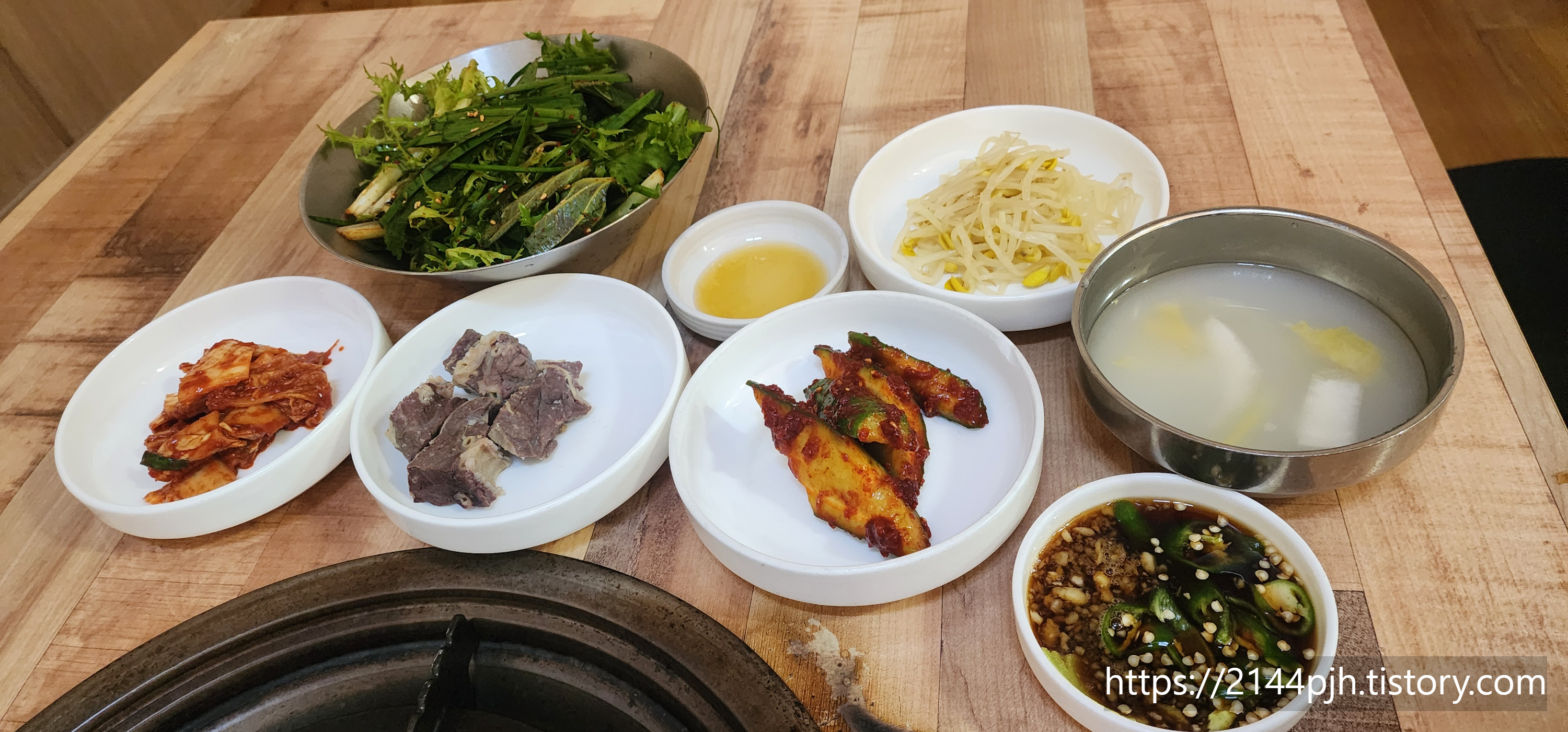 시원한 동치미, 김치, 오이무침, 소허파, 부추부침 등 기본찬이 차려졌습니다.