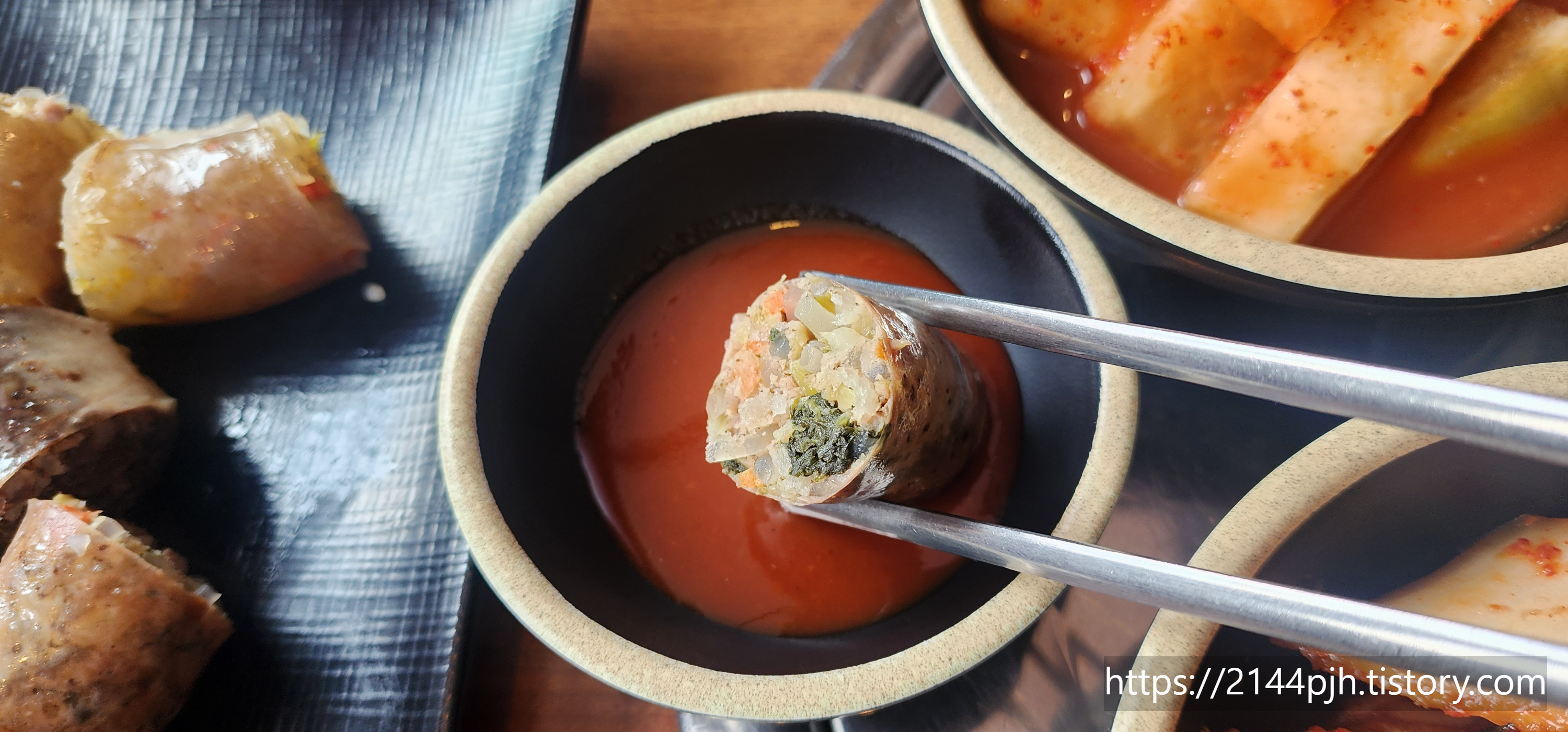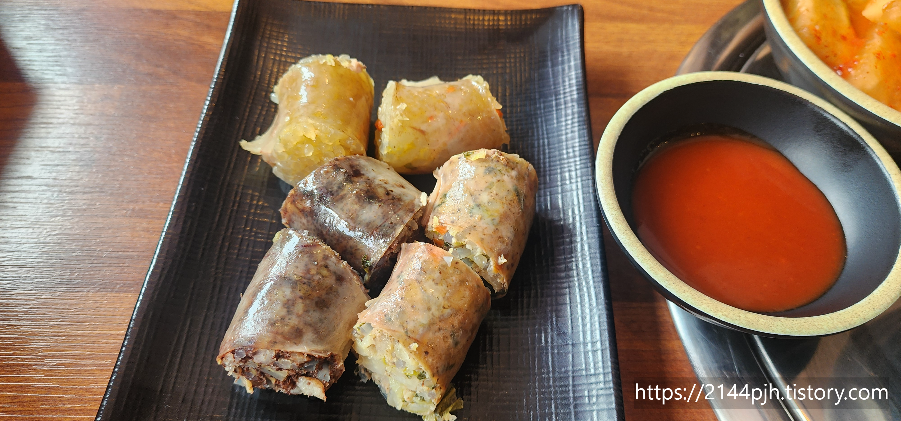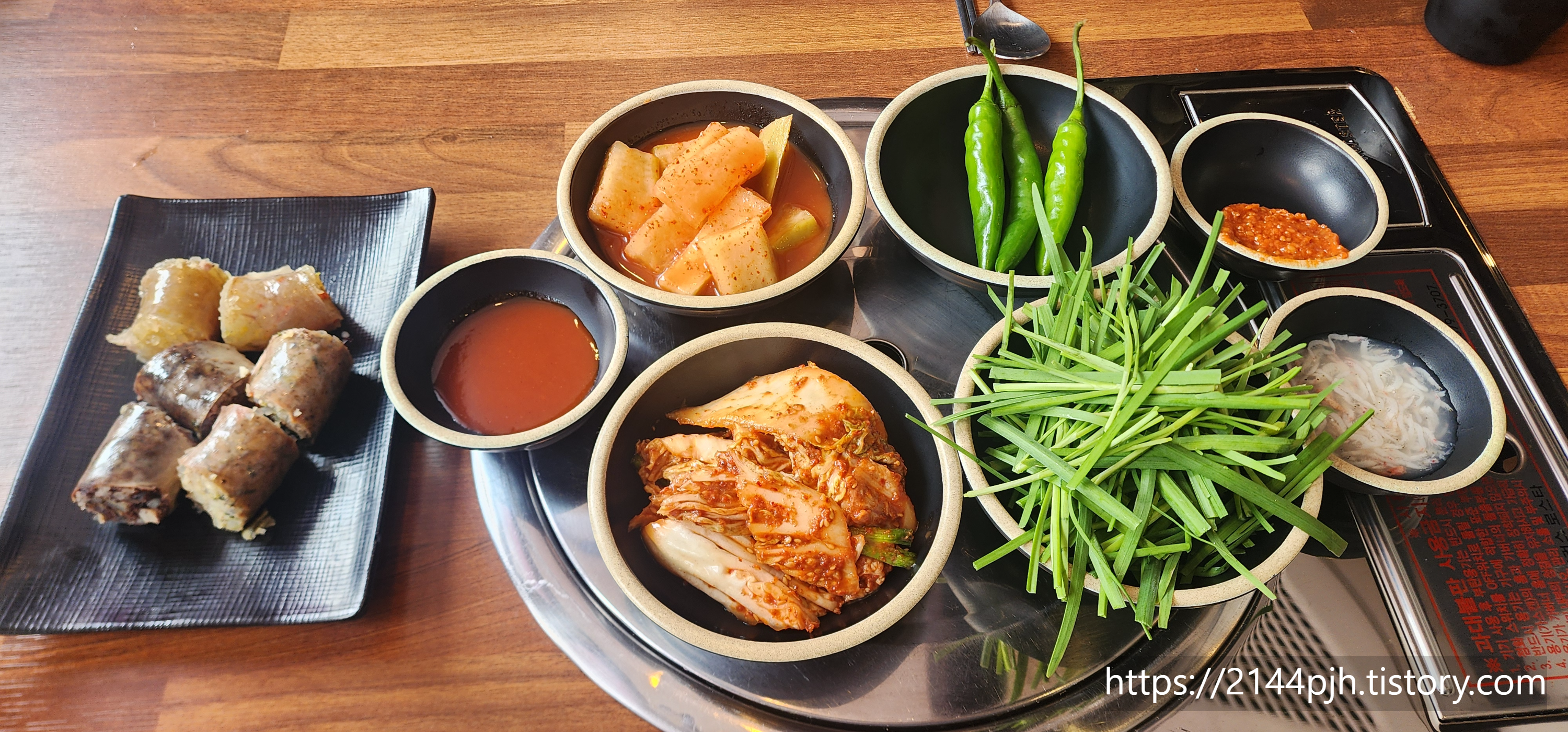 기본 반찬으로 깍두기, 김치, 고추, 부추, 맛보기 순대까지 나옵니다.